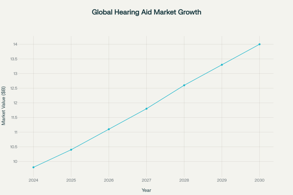 The global hearing aid market is experiencing robust growth, with projections indicating expansion from $9.8 billion in 2024 to $14 billion by 2030. This represents a compound annual growth rate (CAGR) of 6.1%, driven by increasing awareness of hearing health and technological innovations.